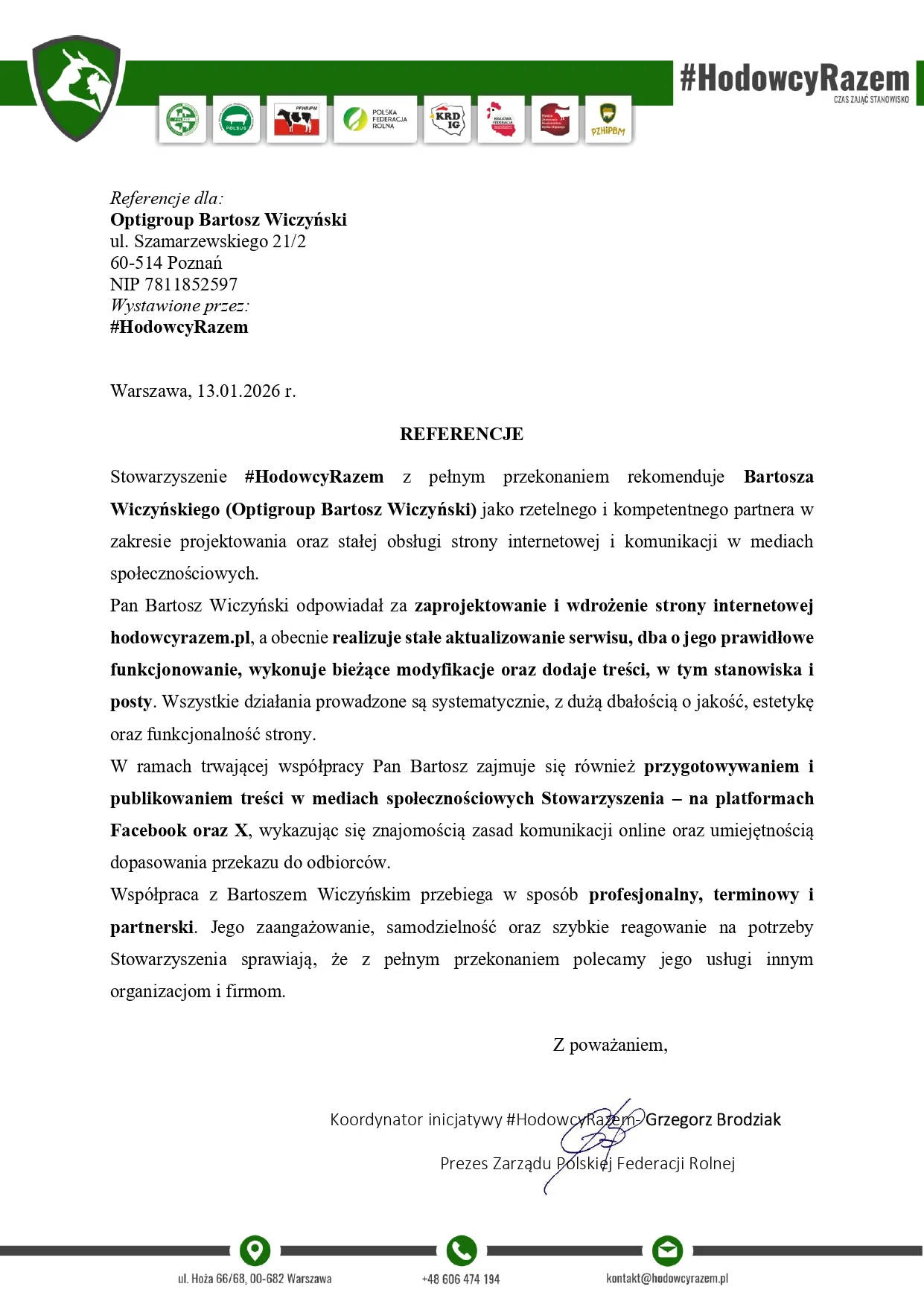 Stowarzyszenie #HodowcyRazem z pełnym przekonaniem rekomenduje Bartosza Wiczyńskiego (Optigroup Bartosz Wiczyński) jako rzetelnego i kompetentnego partnera w zakresie projektowania oraz stałej obsługi strony internetowej i komunikacji w mediach społecznościowych.